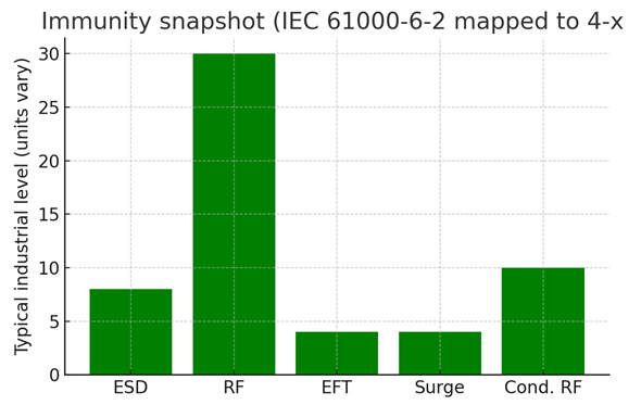 | Immunity | IEC 61000‑6‑2 via 4‑2/3/4/5/6/8/11 | ESD, RF, EFT, Surge, Cond. RF, PF magnetic, Dips | Define criteria A/B/C; test worst‑case modes |
